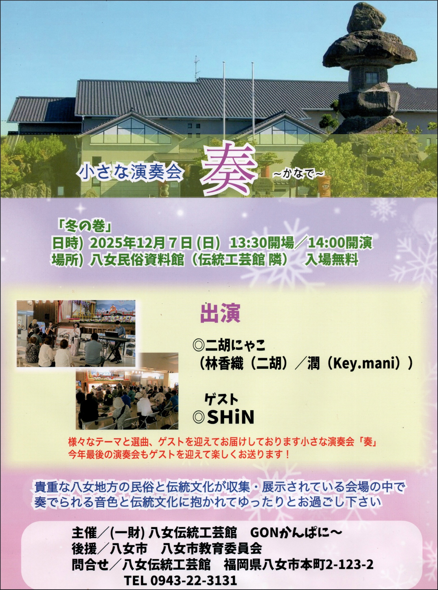 小さな演奏会「奏~かなで~」 貴重な八女地方の民俗と伝統文化が収集・展示されている会場の中で奏でられる音色と伝統文化に抱かれてゆったりとお過ごし下さい。 ◆ 日 時...